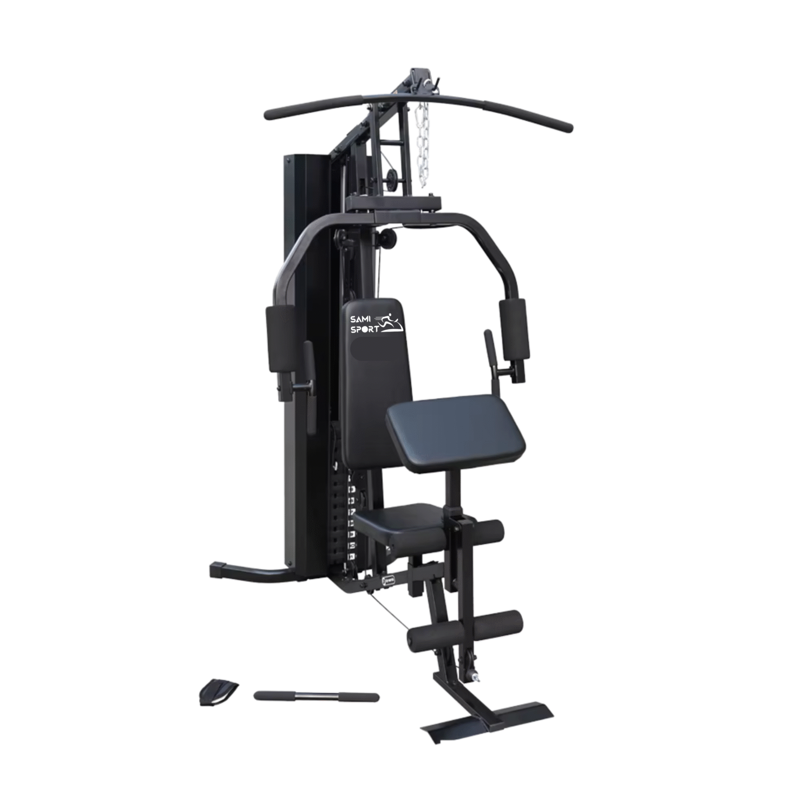 Réalisez un entrainement complet du corps à domicile avec notre presse multi-gym, conçue pour la polyvalence et le confort. Doté de stations de poulie supérieure et inférieure et d’une station de rangée dédiée. cette multi-gym vous permet de cibler facilement plusieurs groupes musculaires. Le confortable rouleau en mousse assure une bonne tenue des jambes pendant les exercices. Le coussin de siège réglable en hauteur garantit un ajustement parfait pour chaque utilisateur. Il est livré avec une barre de traction, une barre courte et une sangle pour cheville.