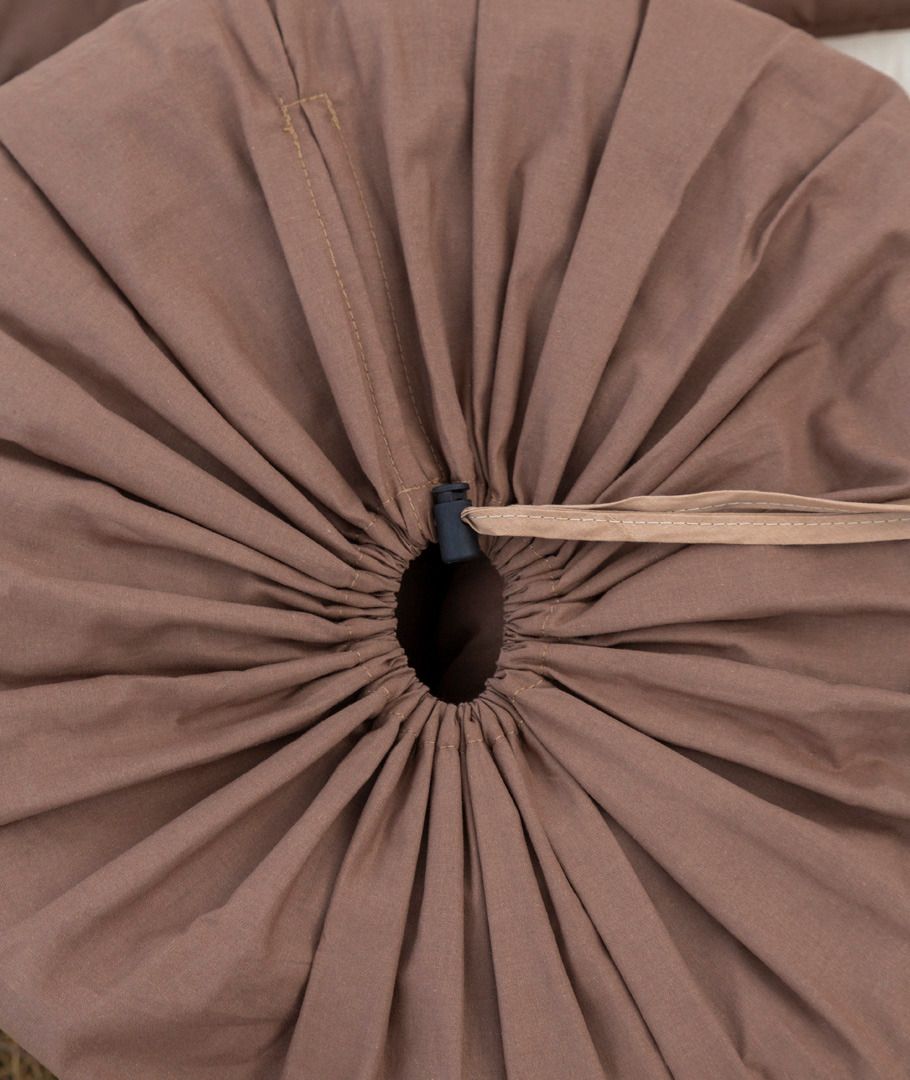 Garnissage en nappe de pure laine vierge de 500 g/m², piquée avec l’enveloppe pour un bon maintien dans le temps. Enveloppe extérieure de coton bio Chocolat peu salissante, doublure intérieure Beige en coton bio également.