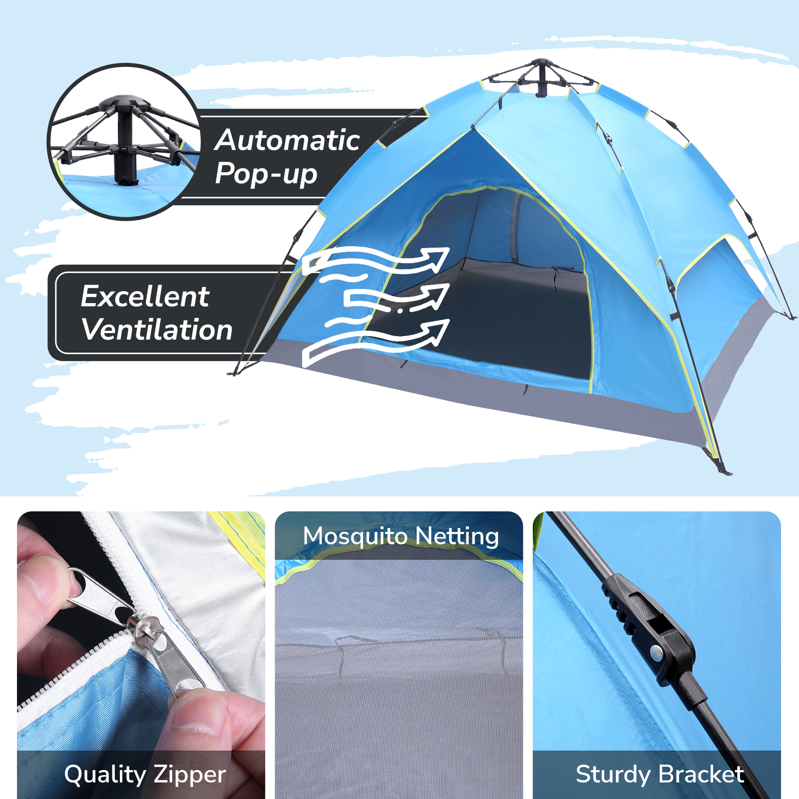 A built-in lantern hook gives you a place to hang your lamp and make you away from the darkness;Double-zipper door design for great convenience to in and out; A storage pocket inside provides a place to put your mobile phone and other important things;Designed with safety reflective stripes;A standard double sewing technique is fully adopted on every suture to ensure an absolutely sturdy and durable seaming.
